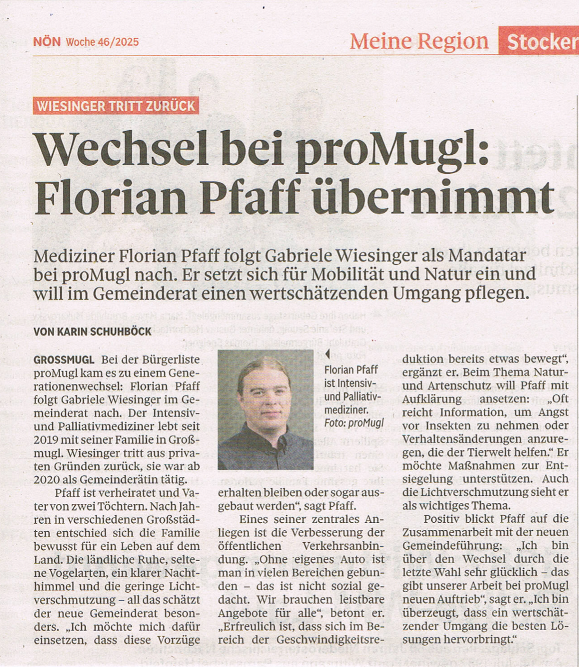 Veröffentlicht am 16. November 202516. November 2025https://www.noen.at/korneuburg/grossmugl-wechsel-bei-promugl-gabriele-wiesinger-uebergibt-an-florian-pfaff-497188805 Dr. Florian Pfaff , neuer Gemeinderat in Großmugl! Teilen