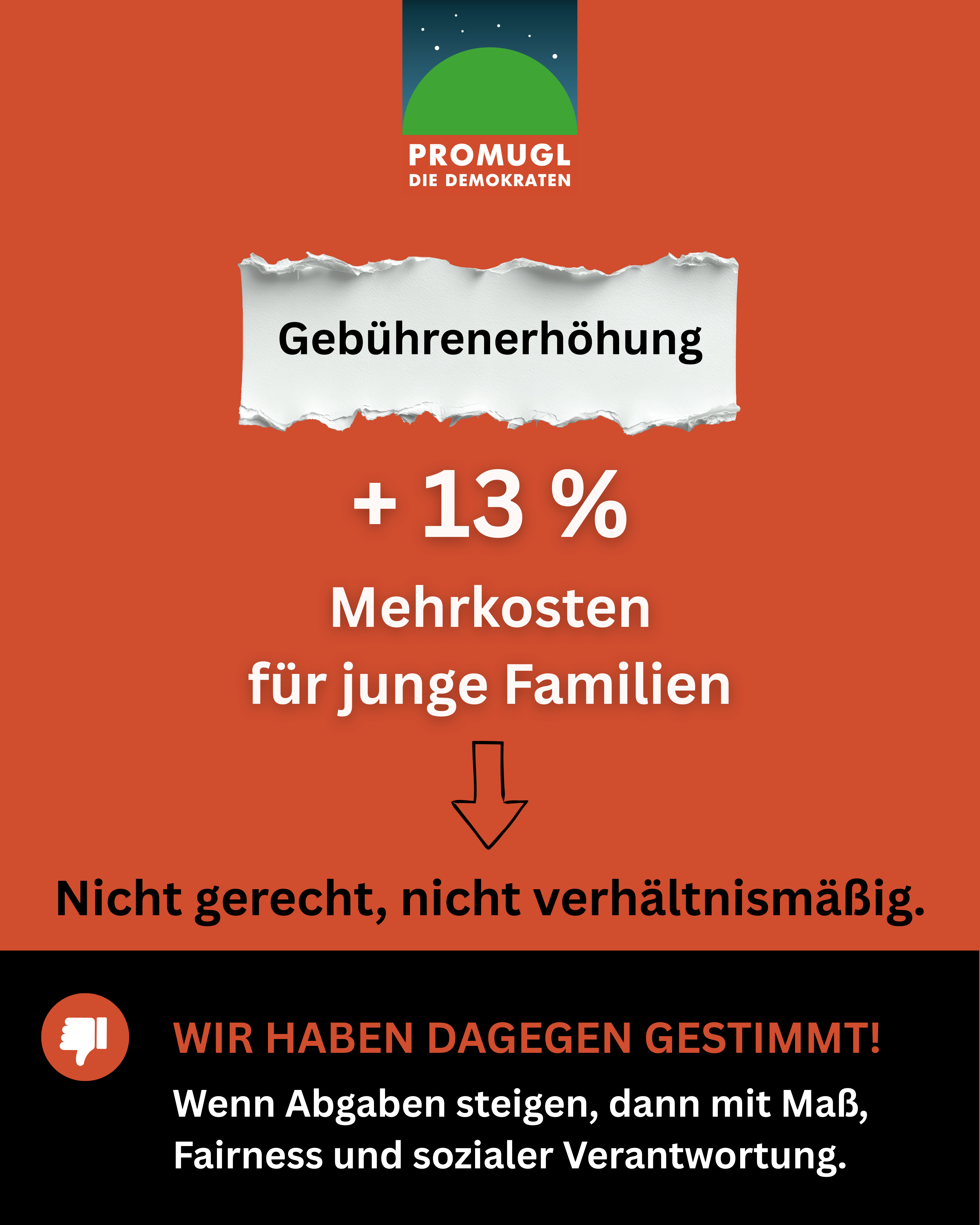 Die Nachmittags- und Ferienbetreuung im Kindergarten und der Volksschule Großmugl ermöglicht Eltern sich ihrem Beruf zu widmen, oft aus finanzieller Notwendigkeit. Die Kostenbeiträge der Eltern steigen nun um 13 %, wir sehen hierin eine unsoziale Zusatzbelastung für junge Familien. Aus diesem Grund haben die Gemeinderäte von proMugl gegen diese sprunghafte Steigerung der Abgaben gestimmt und beantragt, eine gestaffelte Abgabenerhöhung zu veranlassen.